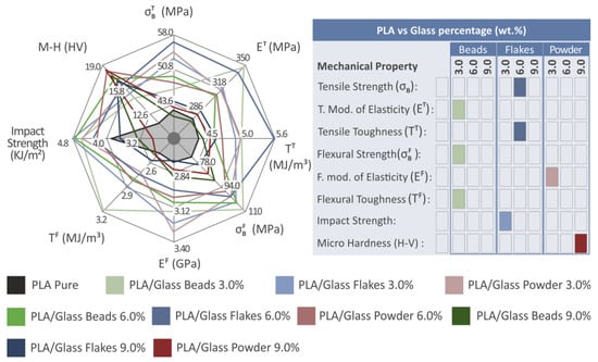 As can be observed in Figure 14, in the majority of the investigations, the PLA/Glass Beads with 3.0 wt.% concentration displayed the highest mechanical response. Particularly, the specimens made with PLA/Glass Beads 3.0 wt.% show notable increases in their flexural properties, including strength and toughness. Additionally, the tensile stiffness has improved significantly. The specimens containing PLA/Glass Flakes 6.0 wt.% show a considerable increase in both the tensile strength (σB) and stiffness when examining the impact of the same type of glass additives. No other mechanical parameter was adversely impacted by the addition of the glass particles, with the exception of the impact strength, which decreased as the filler concentration reached 9.0 wt.%. In conclusion, the unfilled PLA polymer was surpassed in the majority of the investigations, even by the composites with the greatest loading of 9.0 wt.%, which showed superior values in their mechanical properties.