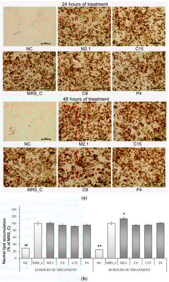 Furthermore, the abovementioned observations were confirmed by measuring the OD values of isopropanol extractions. Intracellular lipid accumulation in MRS_C marked a fourfold increase compared to NC. However, no significant modulation among the differentiated groups was established, regardless of the type or longevity of treatment. The only exception was found in M2.1 after 48 h of exposure, where neutral lipid accumulation was increased by 14% compared to MRS_C (p < 0.05) (Figure 2b).