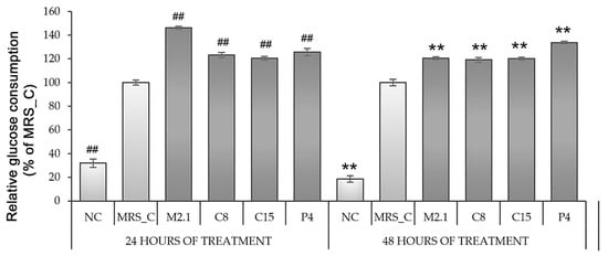 Glucose consumption by fully differentiated 3T3-L1 adipocytes, treated with 10% cell-free supernatants from Lacticaseibacillus paracasei strains. Abbreviations: NC—negative, non-induced control; MRS_C—induced control, treated with MRS; M2.1, C8, C15, P4—experimental groups, induced and treated with supernatants of the respective strains once for 24 h or twice for 48 h. Data (mean ± SEM) are expressed relatively as percentages of the respective MRS_C after excluding the basal glucose consumption found in the non-induced (negative) control group. The symbol “#” and the asterisk indicate the significant differences between MRS_C and all other groups at 24 or 48 h of treatment, respectively: ##, **—p < 0.01.