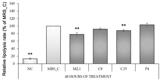Lipolysis rate in fully differentiated 3T3-L1 adipocytes, treated with 10% cell-free supernatants from Lacticaseibacillus paracasei strains. Abbreviations: NC—negative, non-induced control; MRS_C—induced control, treated with MRS; M2.1, C8, C15, P4—experimental groups, induced and treated with supernatants of the respective strains for 48 h. Data (mean ± SEM) are expressed relatively as percentages of MRS_C after the basal lipolysis rate was excluded from the non-induced (negative) control group. The asterisk indicates the significant differences between MRS_C and all other groups, as **—p < 0.01.