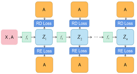 A graph with N nodes and M edges can be represented as , where is the node set and is the edge set . Let be the adjacency matrix of graph ; if and only if , where represents the existence of an edge between node and node . To prevent isolated nodes during training, stands for the adjacency matrix for a graph with added self-loops ; each node is associated with a d-dimensional feature vector . Hence, for simplicity, an attributed graph can be described as . Graph is isomorphic to graph , and we use to represent this relation. What is more, the isomorphism is transitive; if and , then according to transitivity, . GAEs learn a parametric mapping function that transfers the node feature matrix X into low-dimensional latent representations ; formally, .