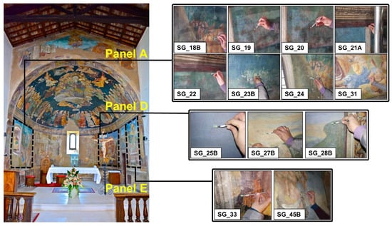 The Italian Association of Archaeometry (AIAr) stipulated a Scientific Agreement with the Regional Secretariat of the Ministry of Cultural Heritage and Activities and Tourism for Abruzzo a few years ago. The initiative, launched in collaboration with the Superintendency of Archaeology, Fine Arts and Landscape for the City of L’Aquila and the municipalities of the Crater, is aimed at the archaeometric study of an important cycle of frescoes in the Church of San Panfilo in Tornimparte (AQ), created along the vault and the perimeter walls of the apse by Saturnino Gatti (1491–1494), a pupil of Verrocchio, and his collaborators []. The cycle of frescoes depicts stories from the life and passion of Christ. In particular, in the middle of the vault, a colorful representation of Paradise is symbolized, with the Eternal Father surrounded by Angels and the Blessed. In the arch above the main altar, the Prophets, who foretold the coming of the Redeemer, are depicted, with the Archangel Gabriel in the act of announcing the birth of the Son of God to the Virgin on the sides. Around the apse, in five panels, the moments of the Redemption are reproduced upon a basement of painted marble, i.e.: “Bacio di Giuda e la Cattura di Cristo”, “Flagellazione e l’Incoronazione di Spine”, “Crocifissione”, “Compianto sul Cristo morto”, and “Resurrezione”.