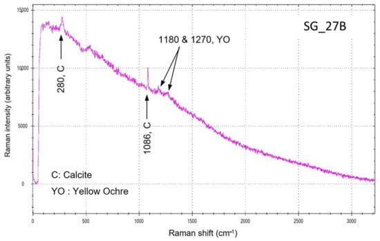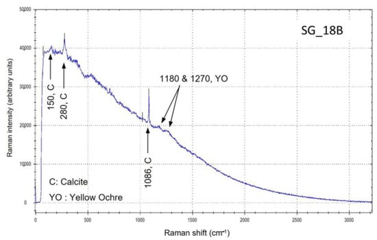 In the case of the SG_18B sample, the spectrum obtained from the yellow-orange area (Figure 2) presents two structures, at ~1180 and ~1270 cm−1, that could be attributed to the goethite of yellow ochre; the contribution of this mineral expected at ~440 cm−1 is probably masked by the high value of fluorescence, mainly due to the binding media. Additionally, the contribution of calcite, reasonably coming from the preparation layer, is visible.
