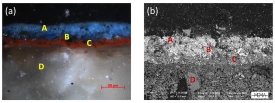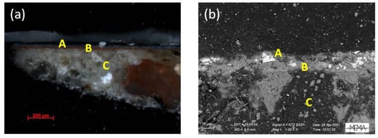 The SG_22 greenish fragment was collected from the sky background (Figure 1) that was probably subjected to chromatic alteration. The cross section, observed under the optical microscope, features three layers, including an altered green layer on the surface (A), a thin red layer, probably morellone (B), and a substrate consisting of mortar (C) (Figure 6). The SEM-EDS elemental analysis (Table 2) confirms the hypothesis of colour shading in the surface pigment; indeed, copper and chlorine were detected on the A layer, in relation to the formation of atacamite, a copper chloride (Cu2Cl(OH)3) and a degradation product of azurite. The presence of iron in the red layer attests to the use of the morellone (B).
