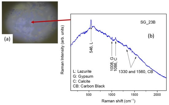 In the case of the SG_23B micro-fragment, the µ-Raman spectrum (Figure 7) collected on a blue area shows the presence of lazurite, as a blue pigment, mixed with carbon black (smoke black), calcite, and gypsum. Importantly, considering the specific historical–geographical context and execution technique of the whole pictorial cycle, the presence of gypsum can be considered as intentionally added by the painter as binding material for the pigments. However, the existence of gypsum, resulting from environmentally activated alteration processes that took place over time onto the topmost pictorial surface, cannot be excluded.