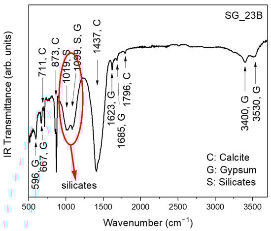 The FT-IR spectrum of the SG_25B sample, reported in Figure 12, appears entirely dominated by the vibrational contributions of calcite and gypsum. No organic binders are observed.