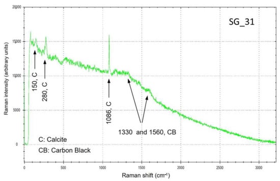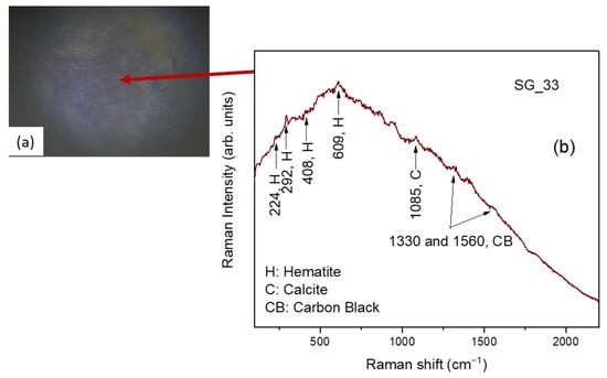 As far as the SG_33 micro-fragment is concerned, the brown area analyzed using µ-Raman (Figure 16) allowed for highlighting all the characteristic peaks of hematite, as a red pigment, mixed with carbon black, as well as calcite from the base.
