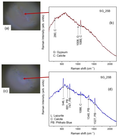 First, a Raman analysis was carried out on a red area (Figure 11a) of the SG_25B micro-fragment, whose spectrum highlighted the presence of calcite and gypsum (Figure 11b). No bands attributable to the pigment were observed. Furthermore, a Raman investigation was carried out on a blue area (Figure 11c), whose spectrum (Figure 11d) allowed for highlighting the presence of lazurite [,], as an azure pigment, mixed with phthalo blue (synthetic inorganic pigment), in addition to the peak at 1086 cm−1 attributable to the calcite plaster.