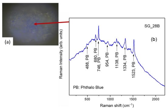 As regards the SG_28B sample, the µ-Raman observation highlights blue areas (Figure 14a). The spectrum (Figure 14b) exhibits all the characteristic peaks of phthalo blue.
