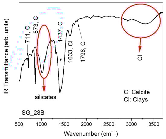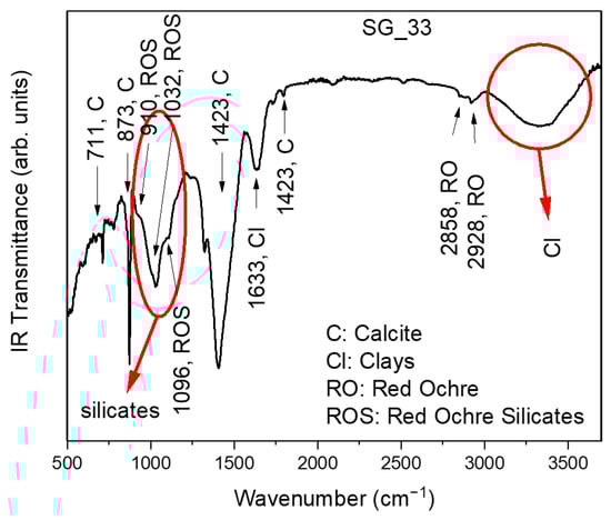 Again, the broad band between ~890 cm−1 and ~1230 cm−1 associated with the presence of silicates appears evident. Within it, the peaks at ~910 cm−1, ~1032 cm−1, and ~1096 cm−1, which can be associated to silicates, probably present in red ocher [], can be distinguished. Finally, the band at ~1633 cm−1 and the broad band centered at ~3300 cm−1, attributed to the OH groups, are indicative of the presence of clayey minerals. No organic binders are observed.