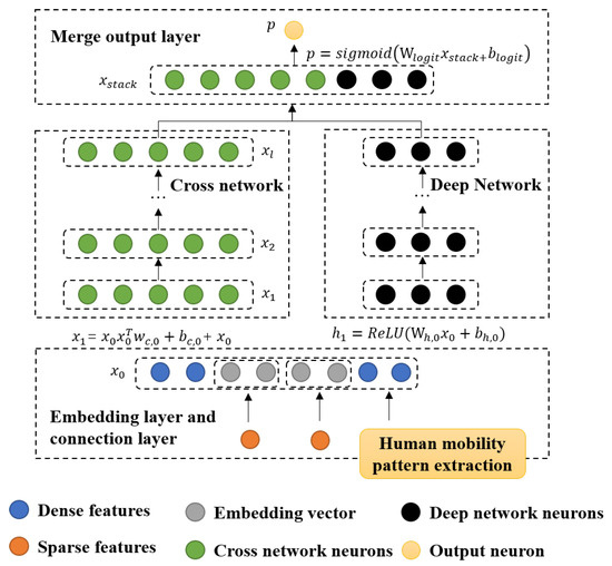 The second-order operation of the cross layer is similar to the outer product operation in the PNN model, on top of which we add the weights of the outer product operation, as well as the input and bias . It can be seen that the cumulative effect of the superposition of the Cross layers on the parameter quantity is relatively slow, and each layer only adds an n-dimensional weight vector , where n is the dimension of the input vector. In addition, the original input vector is preserved at each layer so that the variation between input and output is small. We retain the weight of the human mobility pattern extractor model and separate it out separately, and it is used as part of the urban human mobility feature extraction of the recommendation algorithm [42]. The overall algorithm flow is shown in Algorithm 1.