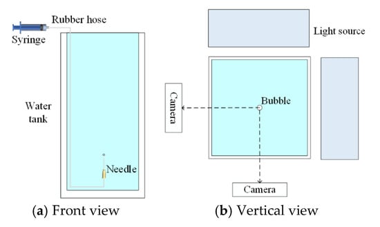 The experimental equipment is shown in Figure 1. The container was a 10 cm × 10 cm × 20 cm square columnar tank with distilled water. During the experiment, the flat needle of the syringe was fixed in the center of the tank bottom, with the outlet facing up. The needle and the syringe filled with air were connected with a rubber hose, so that the syringe could be controlled outside the water tank to produce a single bubble. Different bubbles were produced by using needles with different inner diameters. Two cameras (Nikon D7100) were used to take pictures from two orthogonal directions with the shadow method, and the speed was 120 frames per second. Finally, Tracker software was used to track the bubble’s position and size over time.