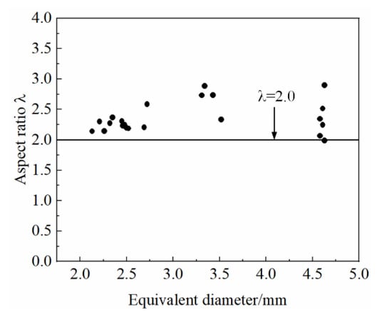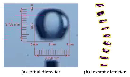 The initial diameter is represented by the equivalent diameter of the bubble when it leaves the needle, as shown in Figure 2, while the instantaneous diameter is represented by the instantaneous equivalent diameter of the side view ellipse. The calculation method for the equivalent diameter is shown in Formula (3).