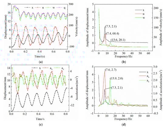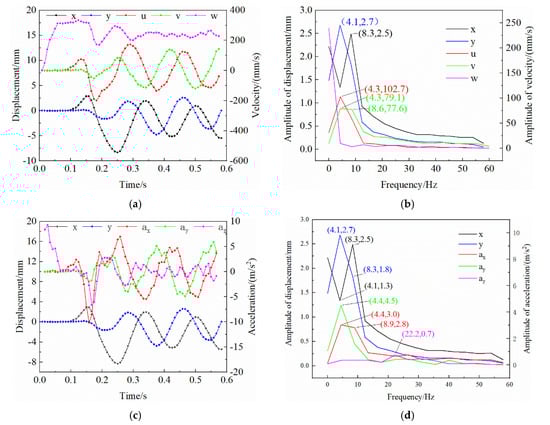 Zigzag movement law of bubbles. (a) Changes in displacement and velocity over time. (b) Displacement and velocity frequency spectrum analysis diagram. (c) Changes in displacement and acceleration over time. (d) Displacement and acceleration frequency spectrum analysis diagram.