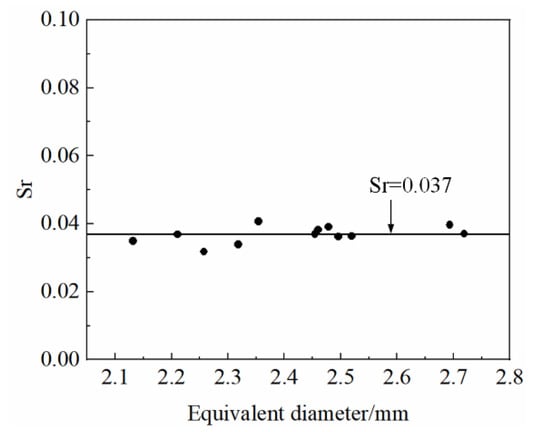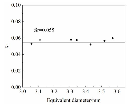 where and are the average velocity and equivalent diameter of the zigzag movement process. According to Formula (5), the Sr of the zigzag movement of bubbles is about 0.055, as shown in Figure 7. The frequency of the trajectory is that of wake vortices. Tomboulides [27] conducted a numerical simulation of the flow around a viscous incompressible sphere and found that under the same Re condition as used in this study, the Sr of the wake oscillation behind the sphere was about 0.195, which is greater than the bubble wake oscillation frequency, indicating that when the trailing vortices drive the bubble to undergo zigzag movement, the oscillation frequency of the wake itself is also hindered.