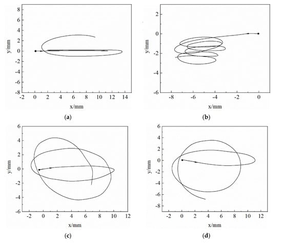 In the process of bubble movement, due to various factors, such as the bubble shape, the changes in the trailing vortices in the x and y planes are not completely identical, which leads to a variety of bubble trajectories, as shown in Figure 8.