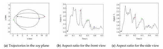 Figure 11 shows the xoy plane trajectory of the bubble from zigzag to spiral and the change curve of the aspect ratio of the bubble in two orthogonal planes. Points of the same color represent the same time. When the bubble’s trajectory changes from a two-dimensional zigzag to a three-dimensional spiral, the size of the aspect ratio and its oscillation amplitude decrease gradually.