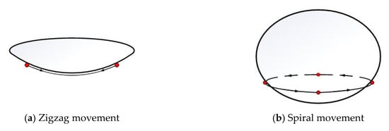 It can be seen from Figure 11 that the bubble is flatter when moving along the zigzag trajectory and more spherical when moving along the spiral trajectory. The effect of the trailing vortices on the bubble can be equivalent to a low-pressure area around the tail of the bubble. Figure 12 shows the movement of the low-pressure area at the tail of the bubble, where the point represents the low-pressure area. The moving trajectory of the low-pressure area will change the sphericity of the bubble. When moving along a zigzag trajectory, the low-pressure area at the trailing of the bubble swings back and forth in a plane, making the shape of the bubble flatter. When bubble moves along a spiral trajectory, the low-pressure area rotates around the trailing of the bubble, and the shape of bubble is more spherical. In short, the change in the bubble shape is the result of the bubble adapting to the flow.
