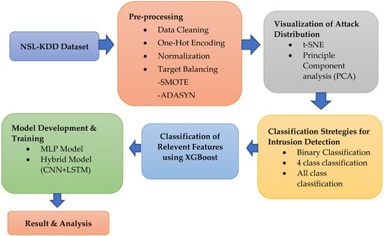Figure 3 presents a clear overview of the proposed approach. The proposed approach starts with the NSL–KDD dataset, which forms the foundation of the intrusion detection system. Several pre-processing steps are used to prepare the data for modeling. Data cleaning to remove inconsistencies or errors, one-hot encoding to represent category features, normalization to bring numerical features to a uniform scale, and target balancing to address class imbalance are all examples. Visualization techniques such as t-SNE and Principal Component Analysis (PCA) are used to obtain insights into the distribution of attacks within the dataset. These visualizations aid in comprehending the patterns and relationships between various kinds of attacks. Three methodologies are used for the classification task: binary classification, four-class classification, and all-class classification. Each technique attempts to categorize network traffic occurrences, separating regular traffic from various sorts of attacks. This enables more granular data analysis and the detection of specific assault types. XGBoost, a gradient boosting technique, is used to discover the most significant characteristics for classification. It evaluates the characteristics according to their importance and selects the top features that significantly contribute to the classification process. During the model building and training phase, two approaches are used: an MLP (Multi-Layer Perceptron) model and a hybrid model that combines a CNN and an LSTM. The MLP model is a standard feed-forward neural network, whereas the hybrid model uses CNN for feature extraction and LSTM for capturing temporal dependencies in data. Finally, the output of the trained models is analyzed and evaluated. To evaluate the performance of the models, metrics such as accuracy, precision, recall, and F1 score are produced.