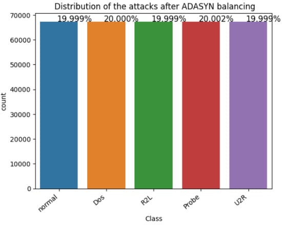 It can be seen in Figure 4 that the dataset is quite unbalanced, which poses a significant challenge for the model’s training because it prevents the model from accurately detecting minority classes such as R2L, probe, and U2R. Classes were balanced to address this problem. These methods alter the dataset’s distribution of the label categories by either undersampling majority classes, oversampling minority classes, or using a combination of the two methods such as SMOTE and ADASYN.