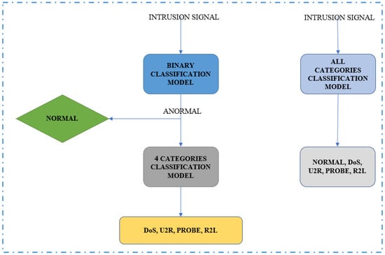 Figure 6 shows the method for making predictions. The first method (on the left) assigns the intrusion signal a normal or abnormal classification. The four-category classification approach forecasts the type of assault if the signal is categorized as abnormal. The second method (on the right) uses the intrusion signal to directly predict the kind of signal into one of the five pre-existing categories.