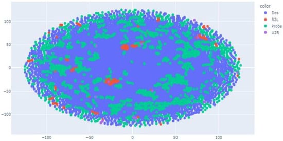 t-SNE [52] was applied to visualize the attack distribution. t-SNE, short for t-Distributed Stochastic Neighbor Embedding, is a technique used to reduce the dimensions of high-dimensional data for visualization purposes. However, it is mainly intended for numerical data and may not be suitable for categorical data. The dataset used for t-SNE visualization in this case had a large number of attributes, indicating that it may have been high-dimensional and could have potentially contained categorical representations. Since t-SNE is not ideal for handling categorical data, an alternative method of dimensionality reduction was suggested, as stated in the FAQ by Laurens Maaten [53].