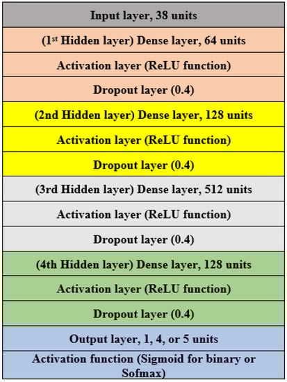 As shown in Figure 9, the initial neural network design utilized for training was an MLP. There were 38 inputs for the features in the input layer, 64 units in the dense layer, and the ReLU activation function. Then, a dropout layer with a ratio of 0.4 was implemented to avoid overfitting by randomly discarding nodes during training. A thick layer of 128 units followed the ReLU activation function in the second hidden layer. Next, a dropout layer with a ratio of 0.4 followed. Next, a dropout layer of 0.4 was placed after a ReLU activation function, and 512 units made up the third hidden layer. Finally, a ReLU activation layer and a dropout layer with a unit count of 0.4 came after the fourth layer, which had 128 units. Following from the model type, either binary, four-category, or five-category, the output layer was a dense layer with one, four, or five units.