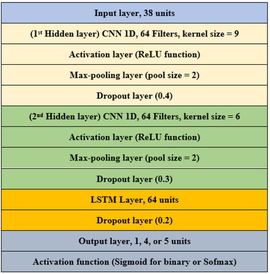 The second neural network design used for training was a hybrid model that combined CNN-1D and LSTM, as shown in Figure 10. The input layer consisted of 38 inputs for the features, and the next layer was a CNN-1D with 64 filters, a kernel size of 9, and a ReLU activation function. After that, there was a max-pooling layer with a pool size of two. Applying a dropout layer with a dropout rate of 0.4 was the next step, to prevent overfitting caused by randomly removing nodes during training. The second hidden layer was a CNN-1D layer with 64 filters and a kernel size of 6, followed by the ReLU activation function. Then, a max-pooling layer with a pool size of 2 and a dropout layer of 0.3 was added. Then, an LSTM layer with 64 units and a dropout layer of 0.2 made up the third hidden layer. Finally, the output layer was dense, with one, four, or five units, depending on the model type—binary, four-, or five-category.