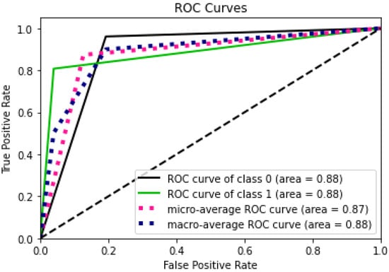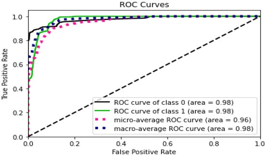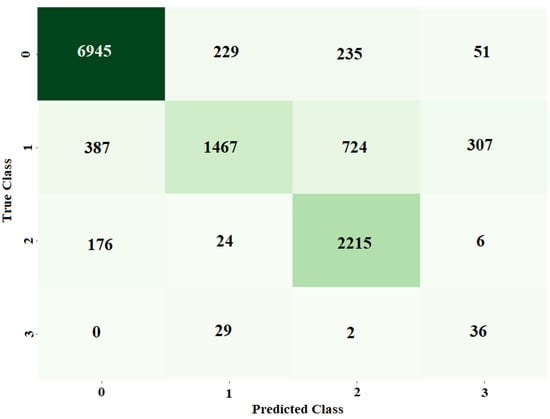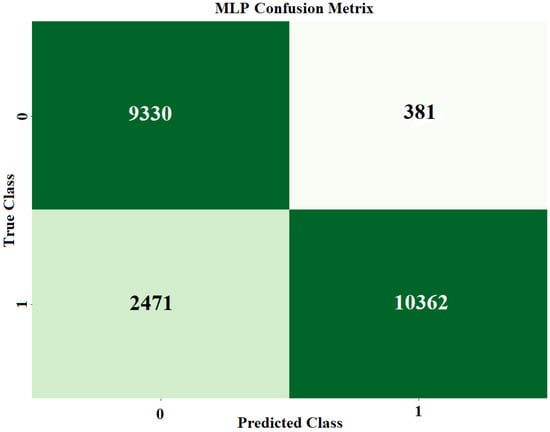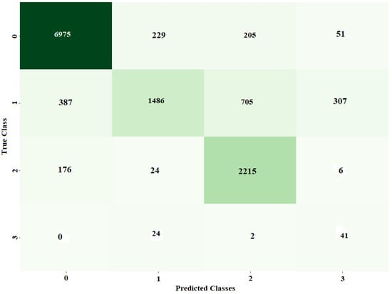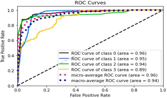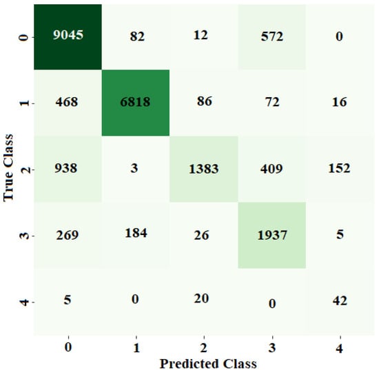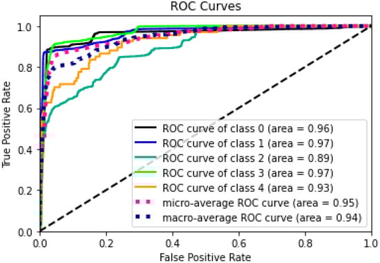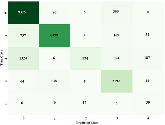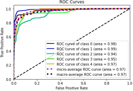 For all-class classification, the same hybrid model outperformed the MLP model. It was possible to use the ADAM optimizer to train the MLP model with a learning rate of 0.001 and batch size of 128, while using the categorical cross-entropy loss function. The MLP classifier had 94% above-average results for accuracy, precision, recall, and F1. The hybrid CNN + LSTM model, on the other hand, was trained over 30 iterations using the binary cross-entropy loss function and the ADAM optimizer, with a learning rate of 0.001 and a batch size of 128. The hybrid model’s metrics—accuracy, precision, AUC score, recall, and F1—were all greater than 97%. Figure 18 displays the MLP model’s confusion matrix. Each row in the algorithm consists of a prediction class, whereas each column in the matrix indicates an actual type. For example, anticipated values of 6499, 974, and 2192 were adequately predicted to be class 1, class 2, and class 3, correspondingly, while class 0 was adequately predicted to be 9711, compared to 9325. The hybrid model’s ROC curves have an AUC value for class 0, 1, 2, 3, and 4, respectively, of 0.96, 0.97, 0.89, 0.97, and 0.93.