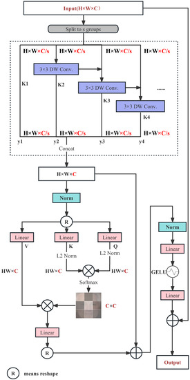 The architecture of the GDTA block. The GDTA block partitions the input tensor into s channel groups and employs 3 × 3 depth-wise convolutions to achieve multi-scale spatial feature mixing. The skip connections between branches enhance the overall receptive field of the network. Specifically, branches K3 and K4 are progressively activated in stages 3 and 4, respectively, resulting in an increased receptive field in the deeper layers of the network. In the GDTA block, a transpose attention mechanism is utilized, followed by a lightweight MLP, which applies attention to the feature channels. This results in computational complexity that scales linearly with respect to the input image.