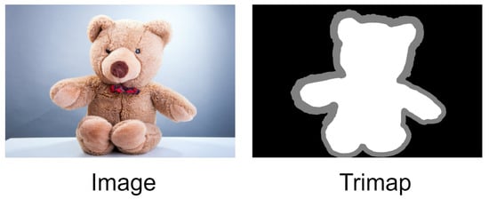 The image and its corresponding trimap are presented, where the foreground, background, and unknown regions of the trimap are denoted by white, black, and gray colors, respectively.