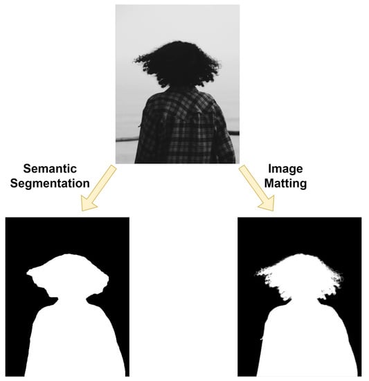 The results generated by image matting may appear similar to those of semantic segmentation; however, in reality, they are fundamentally different techniques. Semantic segmentation is a classification task that extracts the semantic information in the input image and then classifies the pixels individually to obtain the semantic mask of the input image. When semantic segmentation only segments the foreground and background, the binary nature of segmentation leads to a strict boundary near the foreground edge. Image matting is a regression task that involves estimating the opacity of each pixel in an input image, which results in the extraction of the foreground via the alpha matte. A comparison of the results of semantic segmentation and image matting is shown in Figure 3.