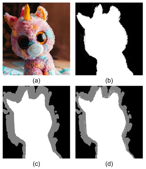 Image matting process: (a) original image, (b) corresponding alpha matte, (c) manual trimap, and (d) trimap automatically generated by expansion and corrosion. It is observed that (d) is significantly rougher than (c).