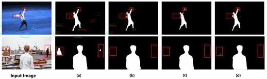 The first row displays the model’s output alpha mattes for a motion-blurred image, while the second row displays the model’s output alpha mattes for different scales in the foreground image, where (a) represents the output of the PPM [35] model, (b) represents the output of the AIM [29] model, (c) represents the output of the P3M [30] model, and (d) represents the output of the RVM [34] model. As shown in the figure, the methods perform poorly in capturing the motion-blurred objects indicated by the red rectangles in the first row. Additionally, when objects with different scales, as indicated by the red rectangles in the second row, appear in the image, these methods generally fail to extract them accurately and tend to only capture the most prominent objects.