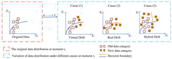 It can be seen that Pt(y) and Pt(x|y) also affect Pt(y|x), thus indirectly causing a real concept drift. The specific manifestations of the concept drift due to different causes are shown in Figure 1, in which (X1, X2) represents the two-digit feature space and y represents its category label.