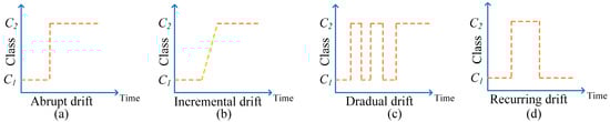 The changes in concept may manifest in different forms over time. At present, the most popular types of concept drift can be divided into abrupt drift, incremental drift, gradual drift, and recurring drift [,,].