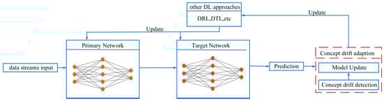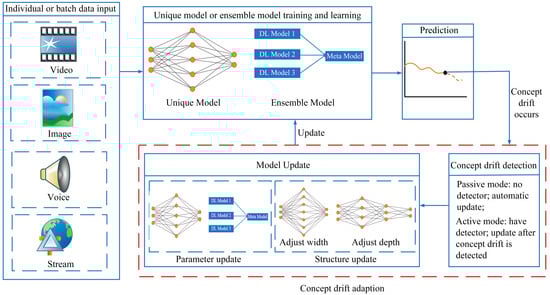 The general adaptation process of concept drift under the deep learning framework when dealing with unstable state data streams is shown in Figure 3. First, the data stream input (single input or batch input) is generally trained and learned by the deep learning model (single model or ensemble model) to obtain the basic prediction results. Next, if concept drift occurs during this process, a concept drift adaptation method will be triggered to update the deep learning model to accommodate concept drift and maintain the model [,]. The concept drift adaptation method can be divided into two parts: concept drift detection and model update. Among them, concept drift detection contains both active and passive modes, and model updates can be divided into structure updates and parameter updates.