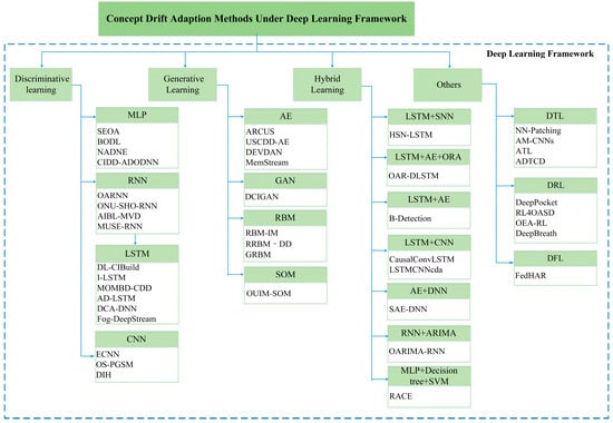In this section, we will summarize concept drift adaptation methods according to the classification of deep learning [], including discriminative learning, generative learning, hybrid learning, and others, as shown in Figure 4. For each part, we will explain the update modes, types of drift adapted, and detection modes. In addition, we will also introduce the characteristics and application fields of deep learning techniques using concept drift adaptation methods.