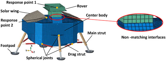 We analyzed the dynamic response of the lunar lander landing process to validate the method; the FEM model is shown in Figure 9. The main components of the lander include: (1) the center body, (2) the payloads and auxiliary equipment and (3) the landing mechanism.