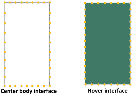 There are 40 support nodes selected on the rover interface and 34 support nodes on the center body interface. The intermediate surface coincides with the rover interface, shown in Figure 11, and with the coefficient and (referring to the size of the interface), the interpolation functions are generated.