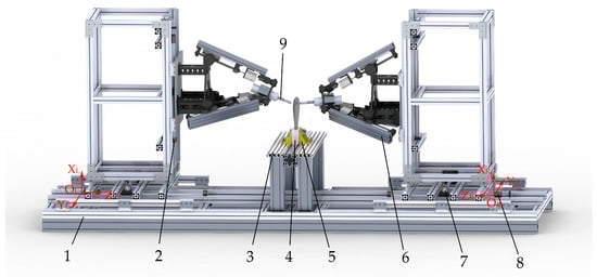 Symmetrical XYZ-3RPS double-sided hybrid machine tool: (1) machine base; (2) X-axis lead screw; (3) workbench; (4) propeller blade workpiece; (5) clamping support; (6) 3RPS parallel mechanism; (7) Y-axis lead screw; (8) Z-axis lead screw; and (9) ball nose end mill.