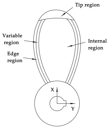 The tip region, which does not meet the division parameter , is generally thinner due to being away from the blade root. It is unable to guarantee the safety of double-sided symmetrical machining in this region; thus, single-sided alternating machining is implemented. Edge region, variable region, and internal region are obtained by dividing the machining-tool-paths meeting the division parameter . The edge region is the portion of each pair of symmetrical-tool-paths that does not meet the division parameter . Due to problems such as insufficient spacing and the intersection of tool paths, it is also unable to guarantee the safety of double-sided symmetrical machining in this region; thus, double-sided staggered machining is used instead. The variable region is a transition region that connects the edge region and internal region, whose length is equal to the edge region. In this region, conversion between symmetrical machining and staggered machining is achieved by the interpolation of machining cutter points through the sigmoid deformation curve. The internal area meets the division parameter and implements double-sided symmetrical machining. The division of the propeller blade surface is shown in Figure 5.
