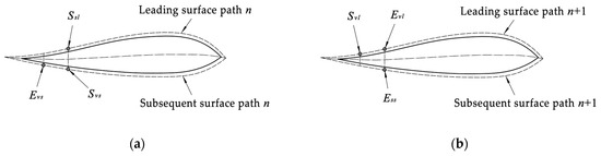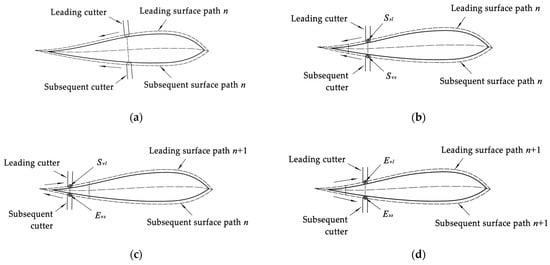 The cutters on both sides are defined as the leading cutter and subsequent cutter, respectively, in the double-sided collaborative machining. In each pair of symmetrical-tool-paths, the cutter that finishes machining first is called the leading cutter, and the other is called the subsequent cutter. The blade surfaces corresponding to the cutters on both sides are called the leading surface and subsequent surface, respectively. In addition, the double-sided collaborative machining also requires six boundary cutter position points to describe the tool path planning process, as shown in Figure 6: speed varied starting point of subsequent surface , staggered starting point of leading surface , speed varied ending point of subsequent surface , speed varied starting point of leading surface , staggered starting point of subsequent surface , speed varied ending point of subsequent leading .