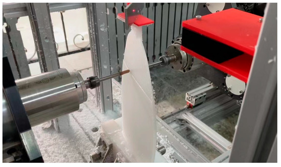 The cutter position points obtained by the tool path planning algorithm are further processed by the post-processing algorithm to calculate the corresponding displacement data and driving speed data of each axis. Finally, the driving data are integrated into a machining file and imported into the motion control system of the symmetrical XYZ-3RPS double-sided hybrid machine tool. Single-sided machining and double-sided collaborative machining experiments were conducted on nylon material workpieces (350 × 200 × 50) using a 3 mm ball nose end mill, with an axial depth of 2 mm and the same machining tool path. As shown in Figure 3, the machine tool is divided into left and right sides, and partial double-sided collaborative driving data on the left side are shown in Table 2 and Table 3. x, y, z, d1, d2, d3 represent the driving displacement of the six driving screws of the XYZ-3RPS hybrid machine tool on the left side, while vx, vy, vz, v1, v2, v3 represent the driving speed of the six driving screws of the XYZ-3RPS hybrid machine tool on the left side. The double-sided collaborative machining process of propeller blades is shown in Figure 9.