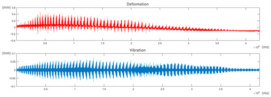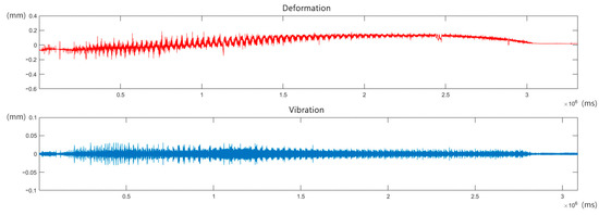 With the help of a laser rangefinder and detection board installed on the blade, the deformation and vibration data of single-sided machining on the left side and double-sided collaborative machining are collected and integrated into this experiment. The comparison curves of deformation and vibration during the machining process are shown in Figure 10 and Figure 11. The red curve represents the axial deformation of the blade, while the blue curve represents the axial vibration of the blade.
