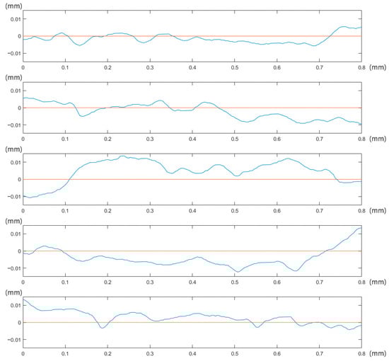 The surface roughness of the area at 0.4R of the blade is measured by laser rangefinder. The evaluation length is composed of five sampling lengths of 0.8 mm, and the roughness curves shown in Figure 12 are obtained by processing the contour curve. The blue color is the roughness curve, and the red color is the arithmetic mean center line. Calculate the arithmetic mean deviation value Ra of the sampling length by Equation (26):