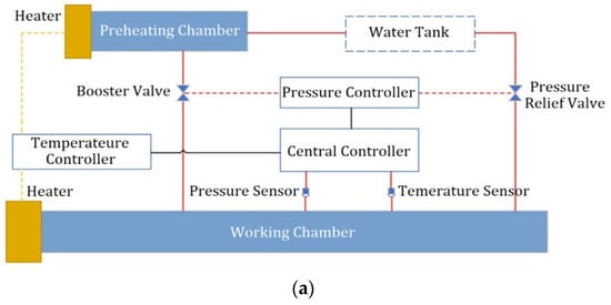 The structure of the temperature and pressure control system is shown in Figure 2a. The loop of water includes: the working chamber, the pressure relief valve, the water tank, the preheating chamber, and the booster valve. We use a two-layer control structure for temperature and pressure control: in the inner layer, the central controller obtains the data of the temperature sensors and the pressure sensor located in the working chamber, plans the decoupling control targets of temperature and pressure based on the sensor data and transmits the targets to the temperature controller and the pressure controller, respectively. In the outer layer, the temperature and pressure are independently controlled. The decoupling control flow of temperature and pressure is shown in Figure 2b. The pressure control is accomplished through the pressure valves. The temperature control is much more complicated because SERCT is a complex nonlinear large time-delay system. In order to increase the speed of temperature regulation, a preheating chamber is designed to preheat the water to be as close to the target temperature as possible before it is replenished into the working chambers. In this way, when the target temperature is below 100 °C, the preheated water replenished into the working chambers causes little temperature change or fluctuations. When the target temperature is higher than 100 °C, by preheating the water, the temperature difference between the replenished water and the water in the working chambers is reduced, and thus, the time for temperature adjustment can be greatly shortened.