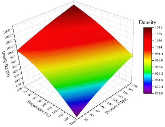 We created the surface decided by Equation (1), as shown in Figure 3. It can be seen that if the density of water is constant, when its temperature rises, its pressure will increase accordingly.