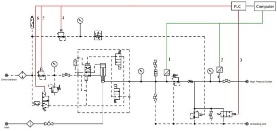 The structure diagram of pressure control is shown in Figure 6. In Figure 6, Inlet is the entrance of water. Drive Entrance is the pneumatic source that drives the piston to pressurize the water under the control of the pressurization valves. High Pressure Outlet is the exit of high-pressure water leading to the chamber. Unloading Port is the pressure relief outlet. The system collects pressure signals through 1 and 2, and obtains control variables for the pressurization valves and pressure relief valves by pressure control algorithm. The pressure is then controlled by PLC to pressurize through 5 and 6 or reduce pressure through 3 and 4. The traditional PID control is prone to overshoot. In the research, a fuzzy-PID dual mode method is adopted to reduce the response time and the overshoot.