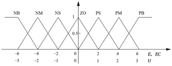 - Set the domain of discourse of E and EC as {−6, −5, −4, −3, −2, −1, 0, 1, 2, 3, 4, 5, 6}, and the domain of discourse of U as {−3, −2.5, −2, −1.5, −1.0, −0.5, 0, 0.5, 1.0, 1.5, 2.0, 2.5, 3};